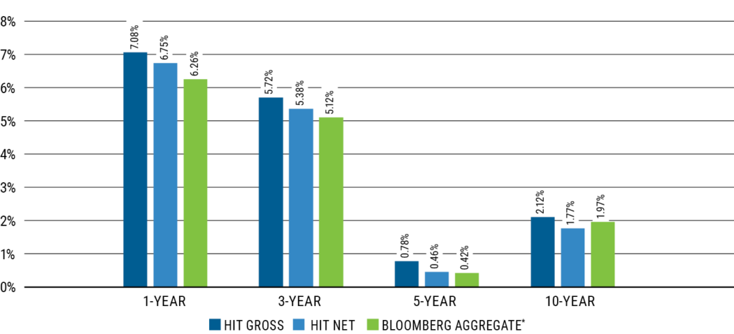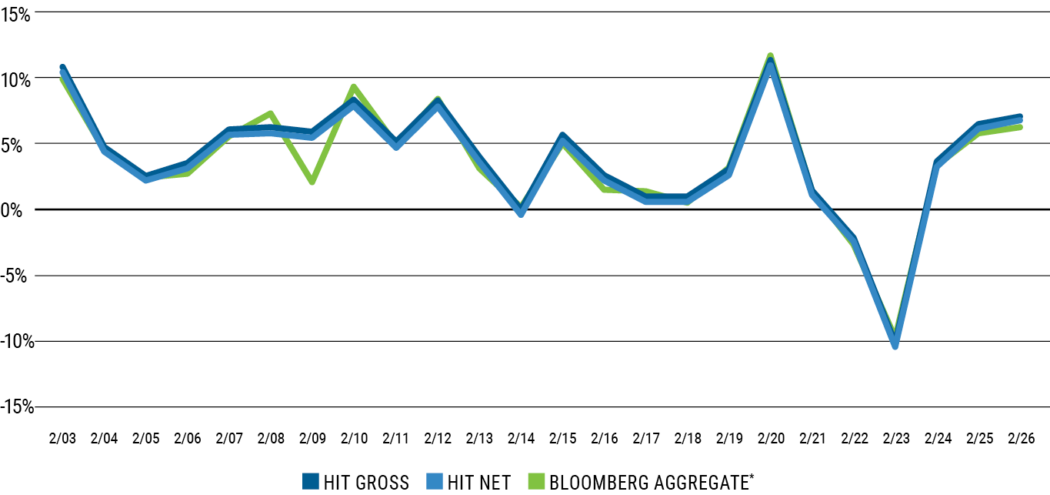 The graph below shows the comparative rolling annual returns of the HIT and Bloomberg Aggregate, demonstrating the strong correlation.