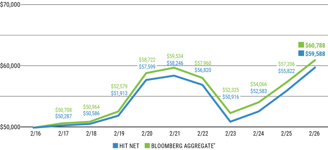 - Although historical month-over-month returns comparing the HIT to the Bloomberg Aggregate show significant correlation, with approximately 99% correlation for the five-year period ending February 28, 2026, the HIT’s very different composition can provide diversification benefits from other fixed-income investments and riskier assets such as equities.