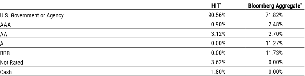 The HIT’s long-standing investment strategy is to construct a portfolio with similar interest rate risk relative to the Bloomberg Aggregate by actively managing duration, while maintaining superior credit quality and a higher yield relative to the benchmark.